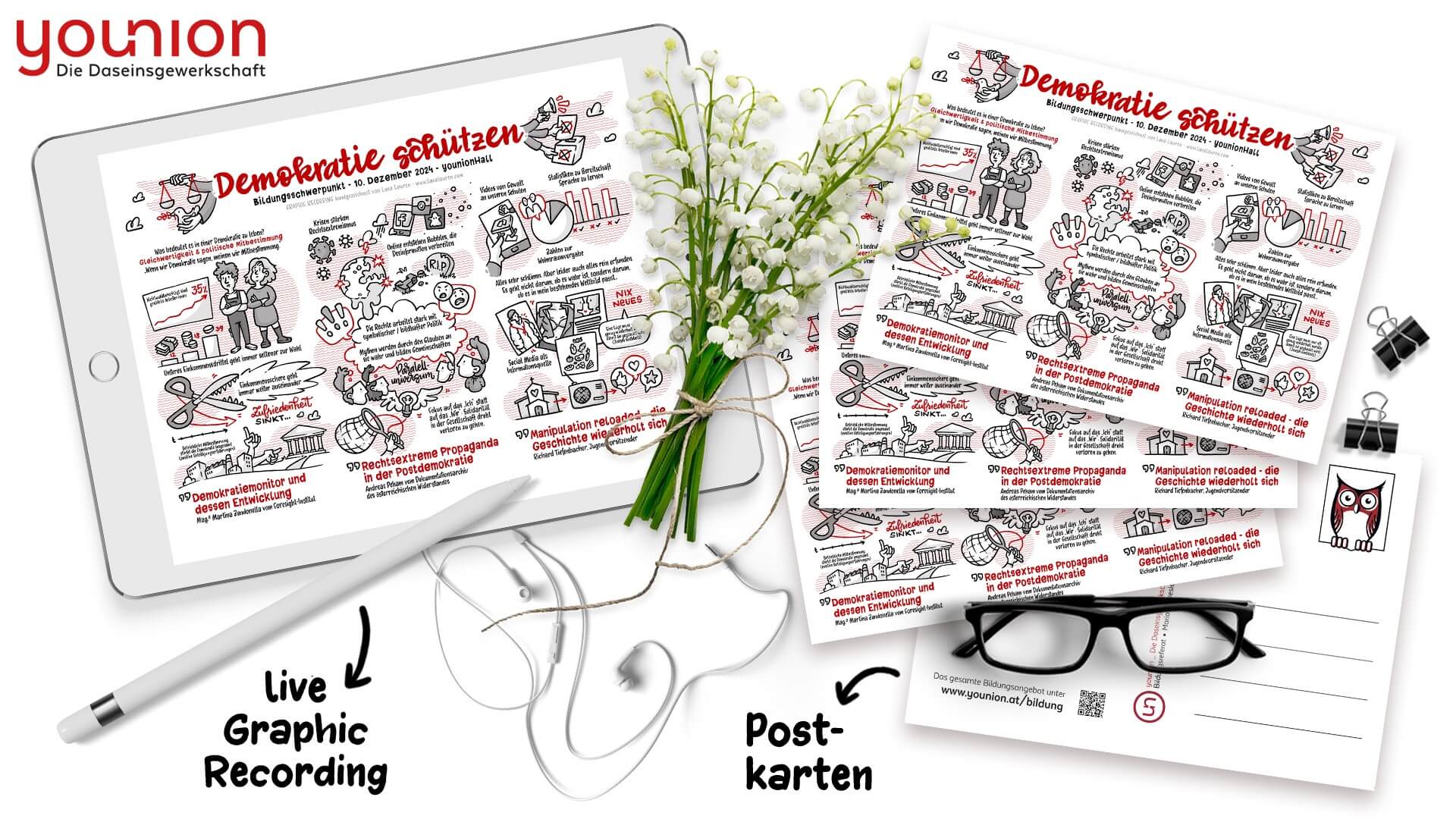 Am Event „Demokratie schützen“ durfte ich die inspirierenden Vorträge und Diskussionen mit meinem Graphic Recording visuell festhalten. Die Veranstaltung bot spannende Einblicke in die Herausforderungen und Chancen für demokratische Prozesse in Österreich und Europa.