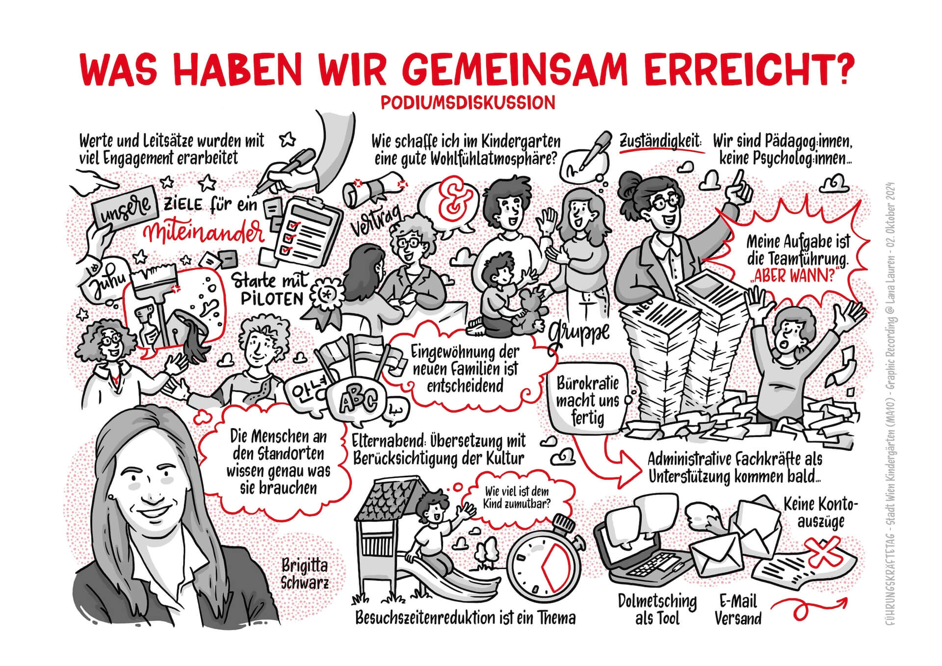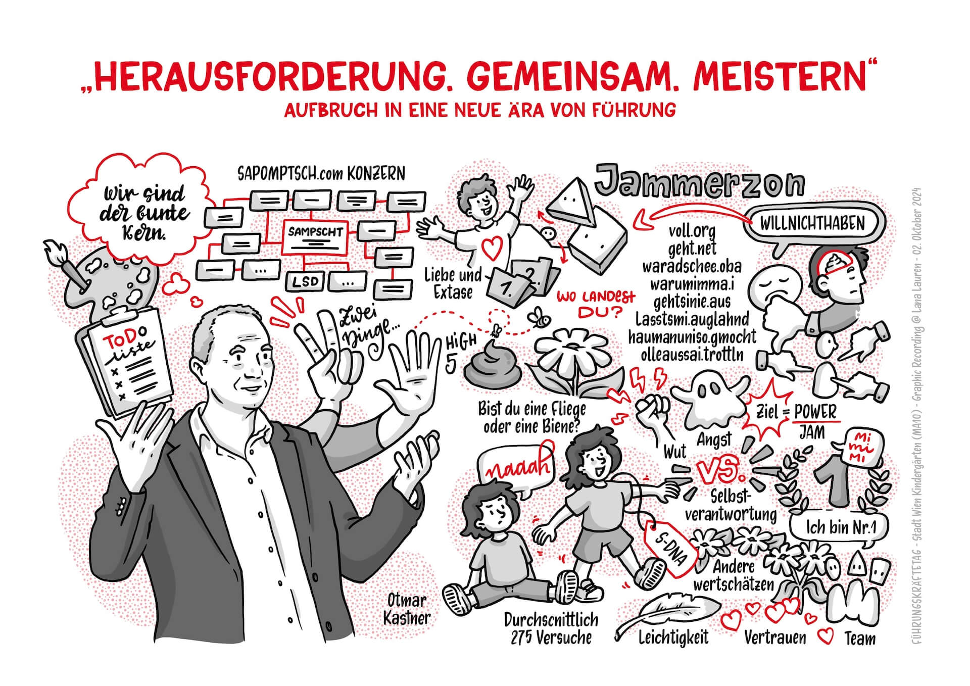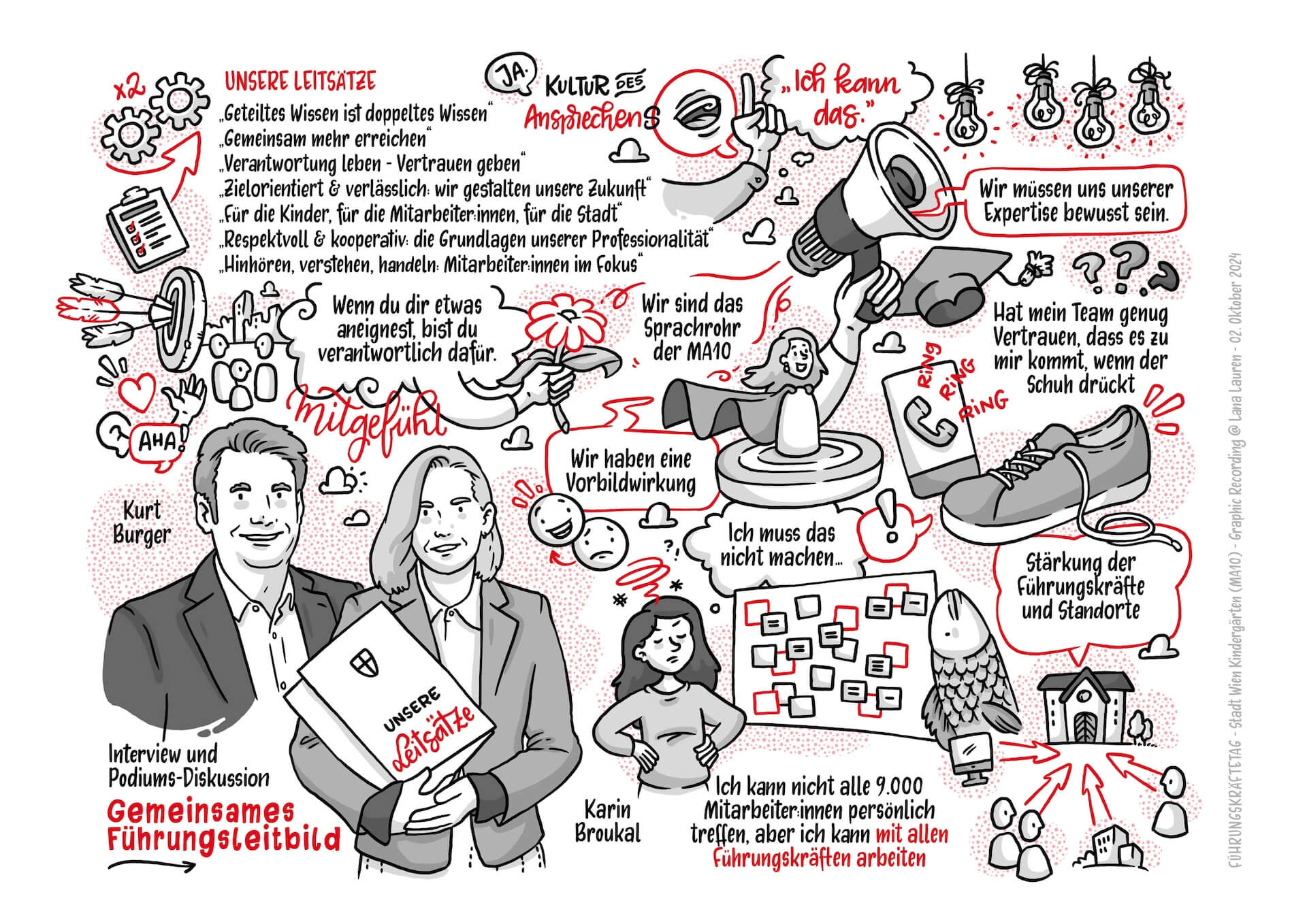 Beim diesjährigen Führungskräftetag der MA10 kamen rund 400 Führungskräfte zusammen, um gemeinsam zu reflektieren, sich auszutauschen und in die Zukunft zu blicken. Das Event bot unter der wunderbaren Moderation von Daniela Soykan-Tober eine Fülle an inspirierenden Vorträgen, Gesprächen und kreativen Momenten – und ich hatte die Freude, den Tag durch Graphic Recording visuell zu begleiten.