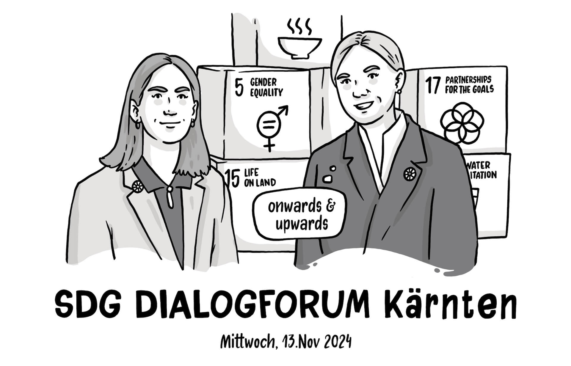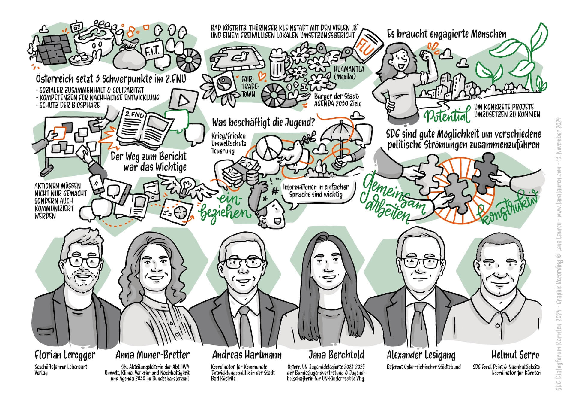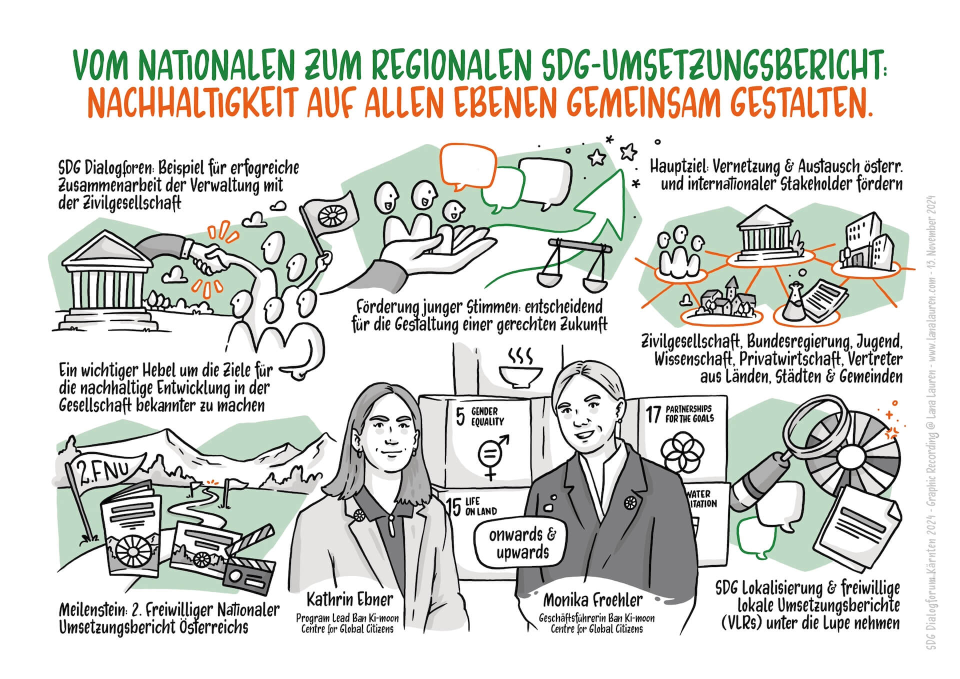 Als Graphic Recorderin hatte ich die Ehre, die Diskussionen und Impulse visuell festzuhalten. Besonders inspirierend war die Auseinandersetzung mit der „Lokalisierung“ der SDGs – also der Übersetzung globaler Ziele in lokale Maßnahmen. Themen wie die Zusammenarbeit zwischen Bund, Ländern und Gemeinden sowie die Bedeutung der Voluntary Local Reviews wurden intensiv beleuchtet.