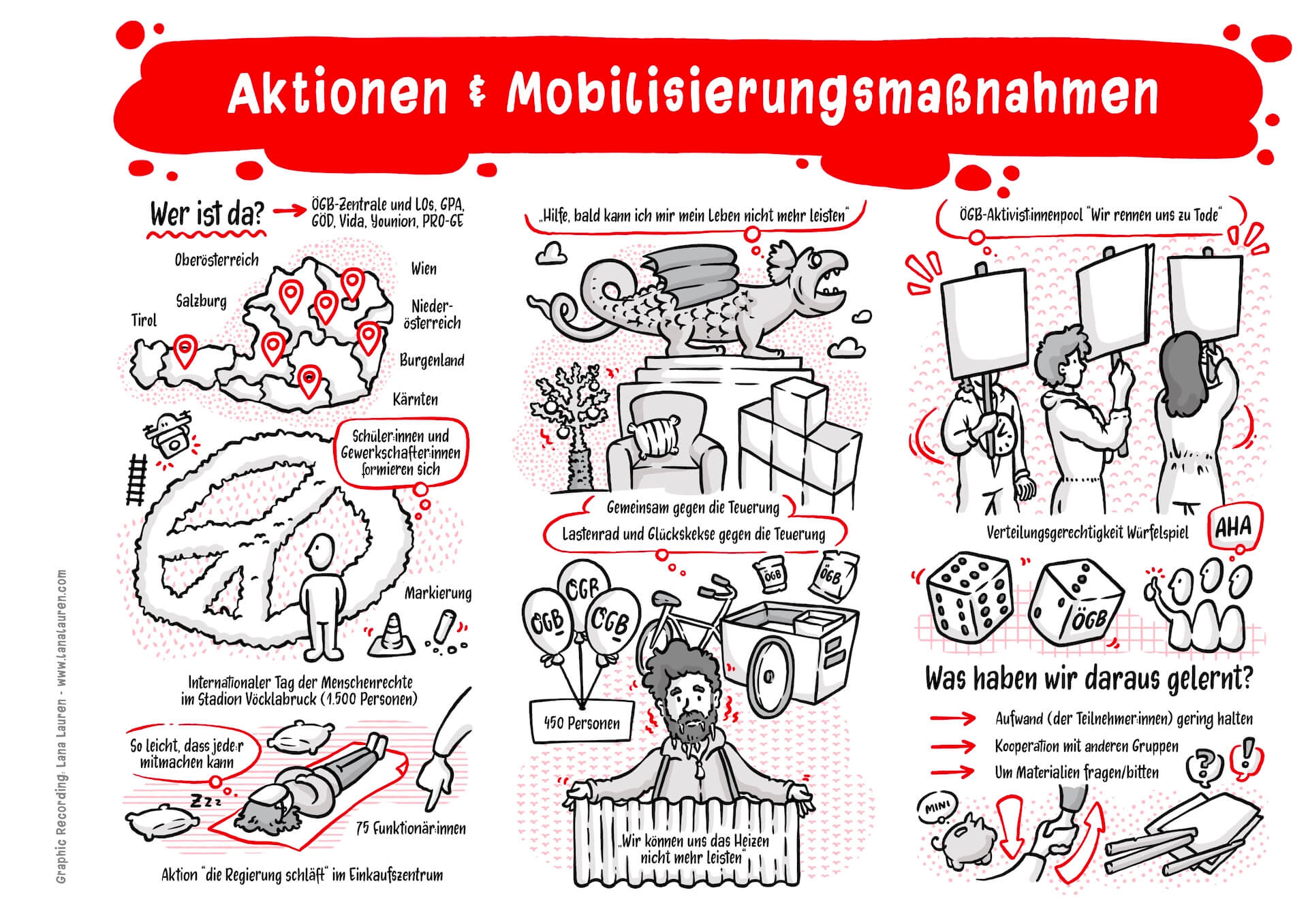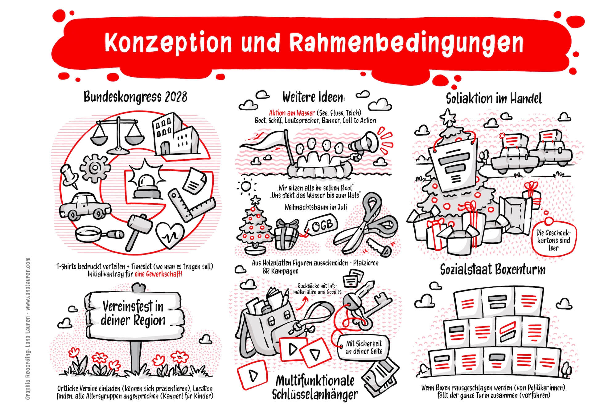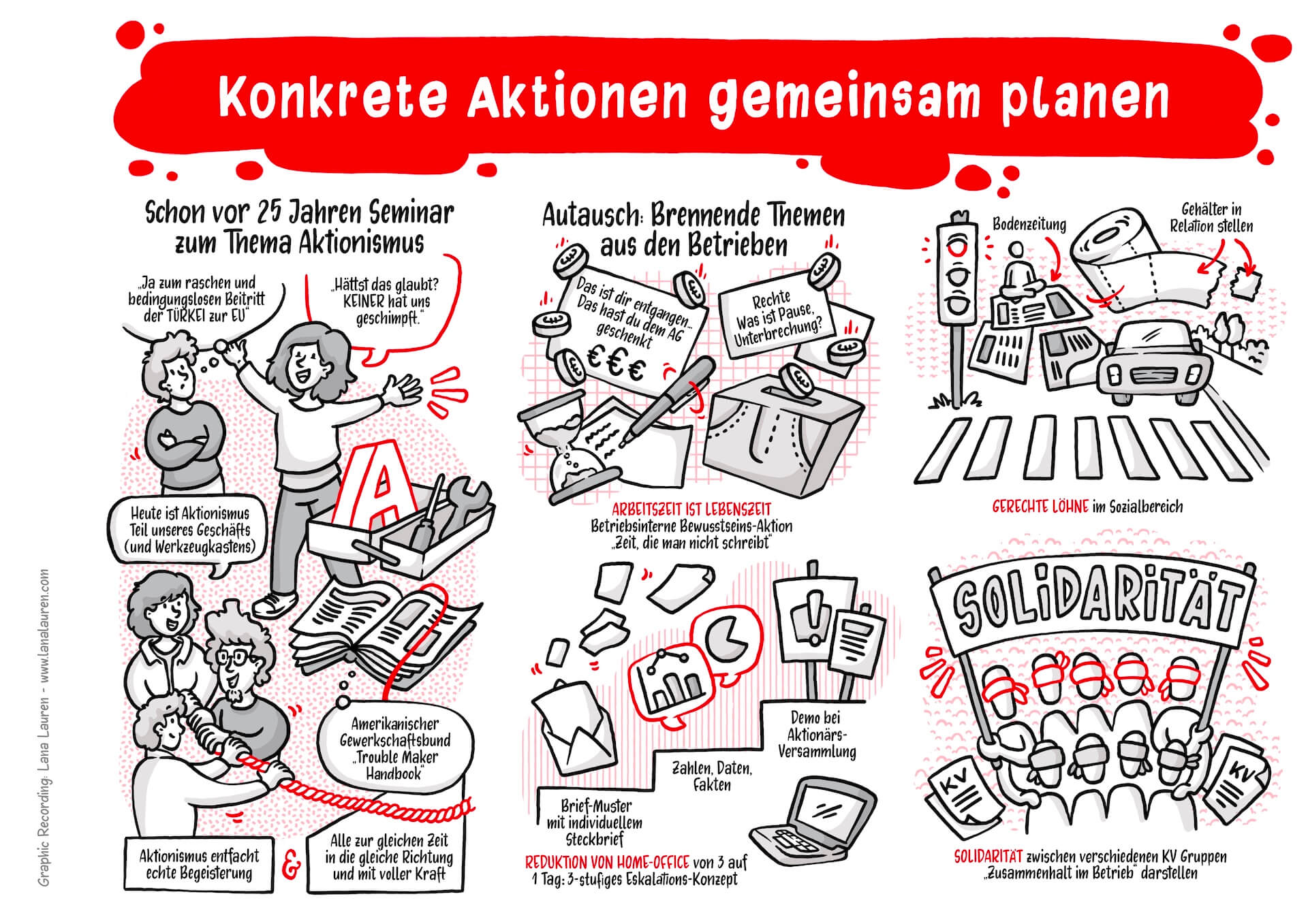 Ich habe das gesamte Event visuell begleitet und durfte in die nicht nur spannenden sondern auch sehr praxisnahen Workshops mit eintauchen. Die Illustrationen unterstützten nicht nur die Reflexion des Gelernten, sondern dienten auch als Abschluss und Zusammenfassung der Tagung und motivierten dazu, kreative Ansätze künftig auch im eigenen gewerkschaftlichen Kontext anzuwenden.