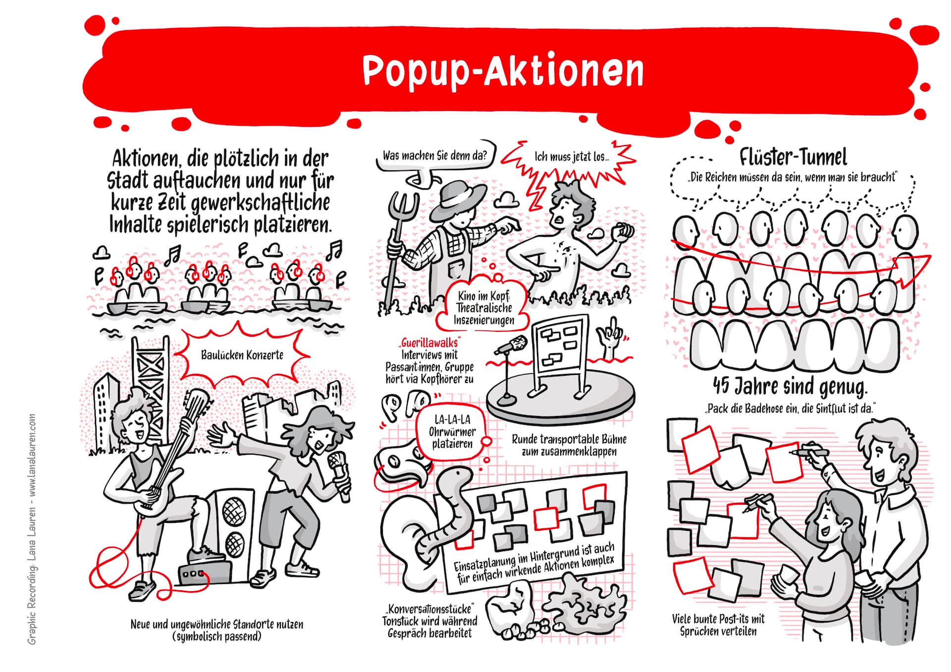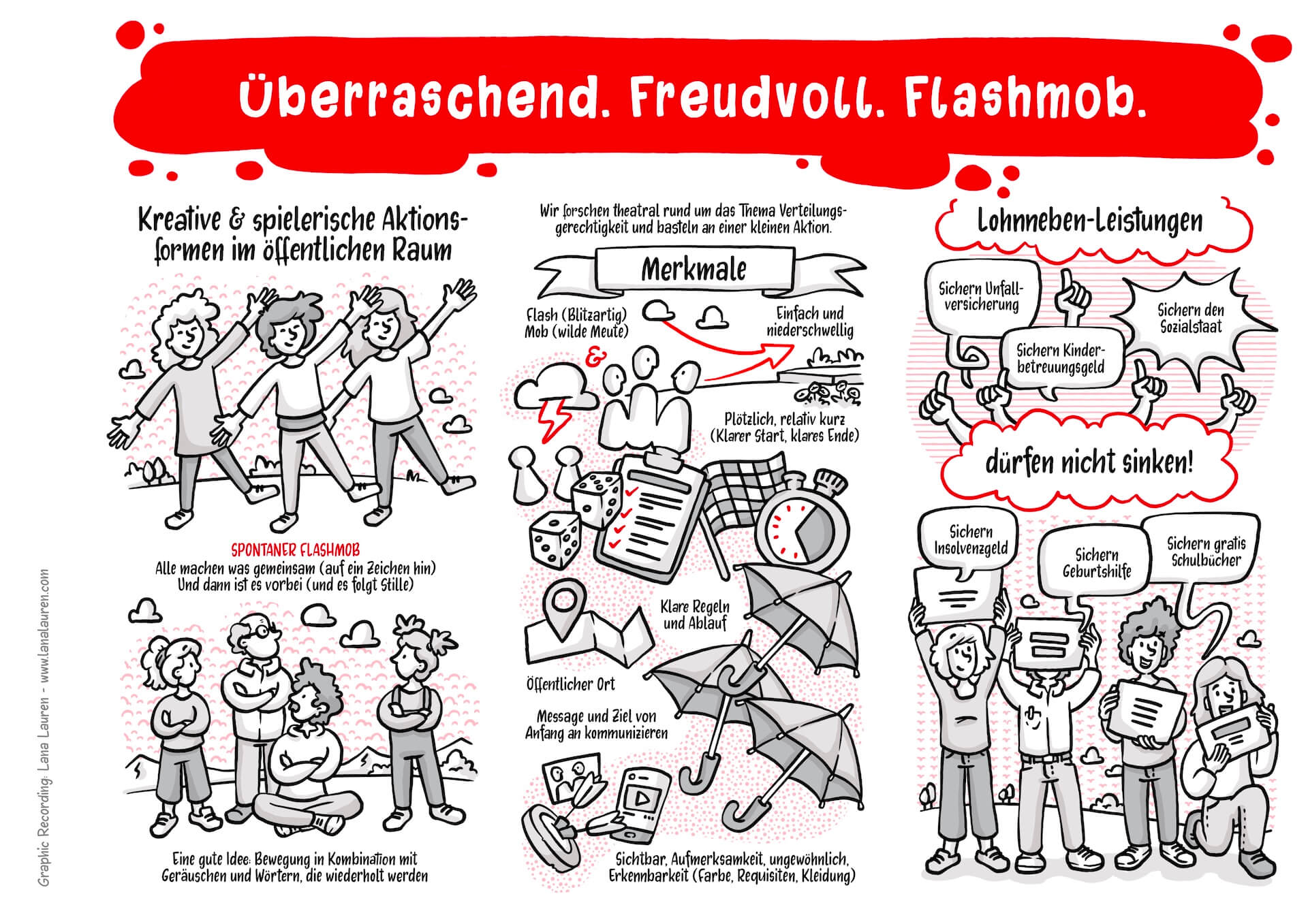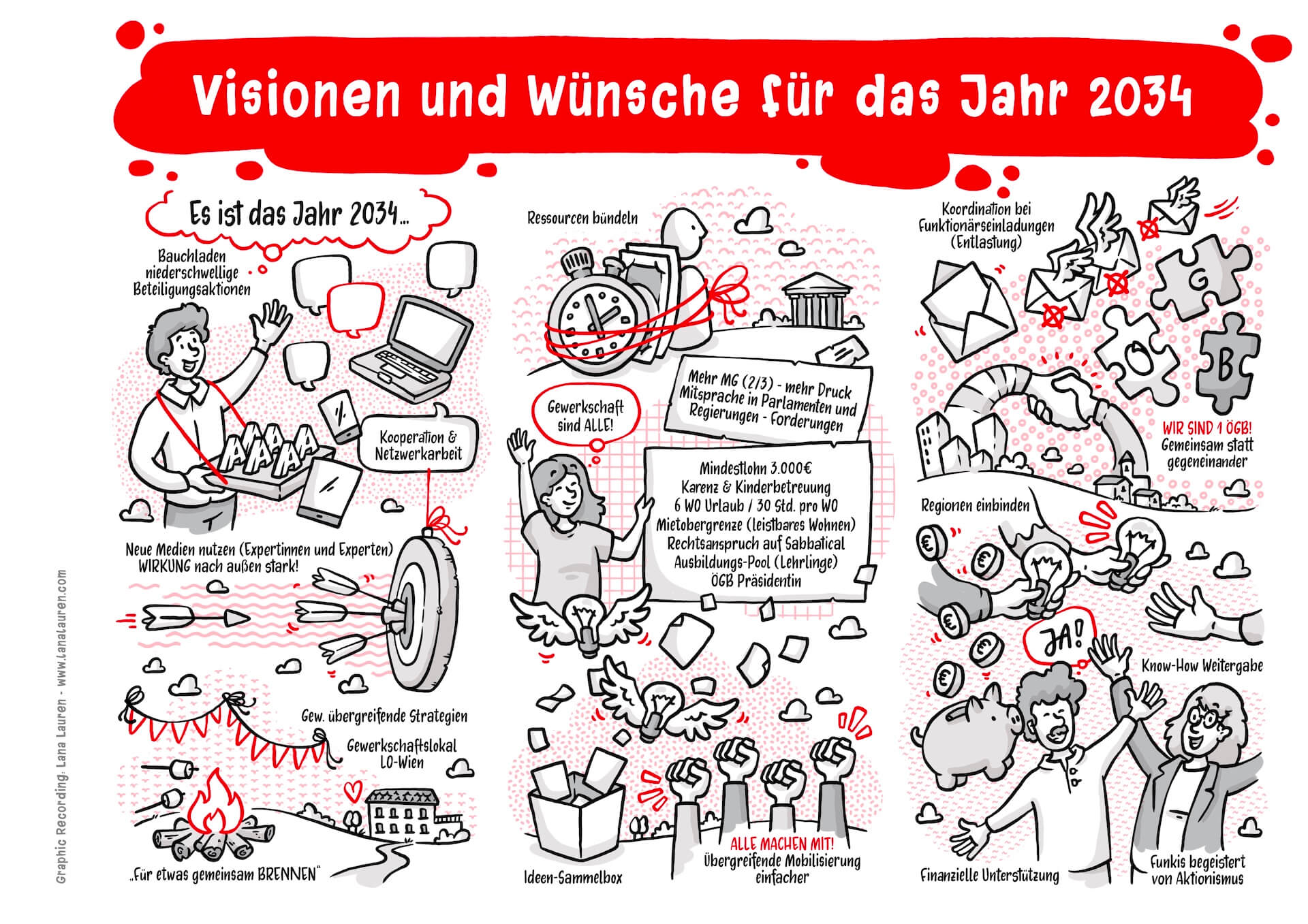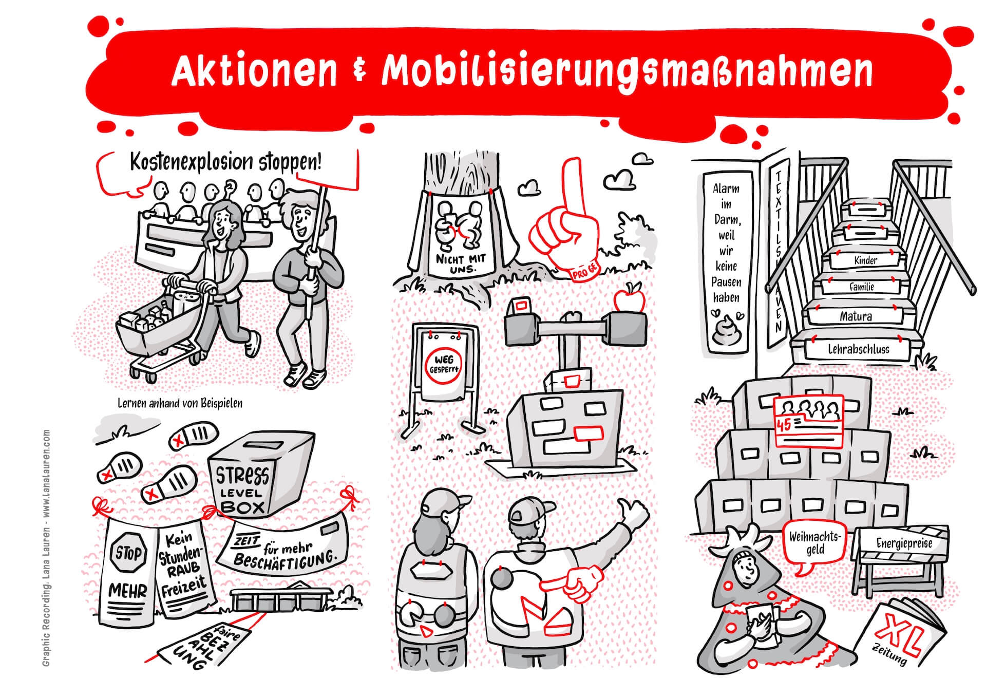 Ich habe das gesamte Event visuell begleitet und durfte in die nicht nur spannenden sondern auch sehr praxisnahen Workshops mit eintauchen. Die Illustrationen unterstützten nicht nur die Reflexion des Gelernten, sondern dienten auch als Abschluss und Zusammenfassung der Tagung und motivierten dazu, kreative Ansätze künftig auch im eigenen gewerkschaftlichen Kontext anzuwenden.